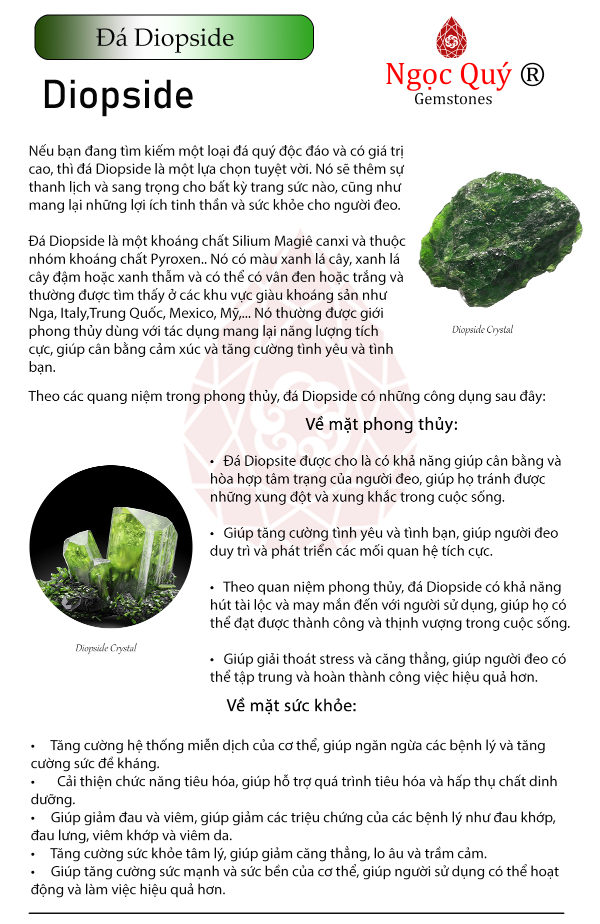 Nếu bạn đang tìm kiếm một loại đá quý độc đáo và có giá trị cao, thì đá Diopside là một lựa chọn tuyệt vời. Nó sẽ thêm sự thanh lịch và sang trọng cho bất kỳ trang sức nào, cũng như mang lại những lợi ích tinh thần và sức khỏe cho người đeo. Đá Diopside là một khoáng chất Silium Magiê canxi và thuộc nhóm khoáng chất Pyroxen. Nó có màu xanh lá cây, xanh lá cây đậm hoặc xanh thẫm và có thể có vân đen hoặc trắng và thường được tìm thấy ở các khu vực giàu khoáng sản như Nga, Italy,Trung Quốc, Mexico, Mỹ,... Nó thường được giới phong thủy dùng với tác dụng mang lại năng lượng tích cực, giúp cân bằng cảm xúc và tăng cường tình yêu và tình bạn.