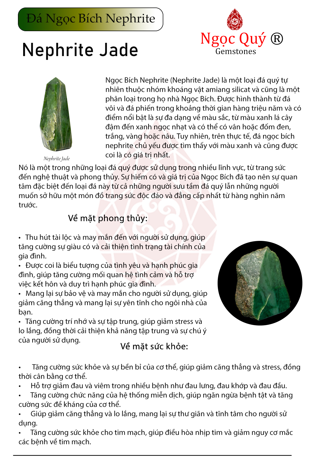 Ngọc Bích Nephrite (Nephrite Jade) là một loại đá quý tự nhiên thuộc nhóm amphibole và cũng là một phân loại trong họ nhà Ngọc Bích. Được hình thành từ đá vôi và đá phiến trong khoảng thời gian hàng triệu năm và có điểm nổi bật là sự đa dạng về màu sắc, từ màu xanh lá cây đậm đến xanh ngọc nhạt và có thể có vân hoặc đốm đen, trắng, vàng hoặc nâu. Tuy nhiên, trên thực tế, đá ngọc bích nephrite chủ yếu được tìm thấy với màu xanh và cũng được coi là có giá trị nhất.