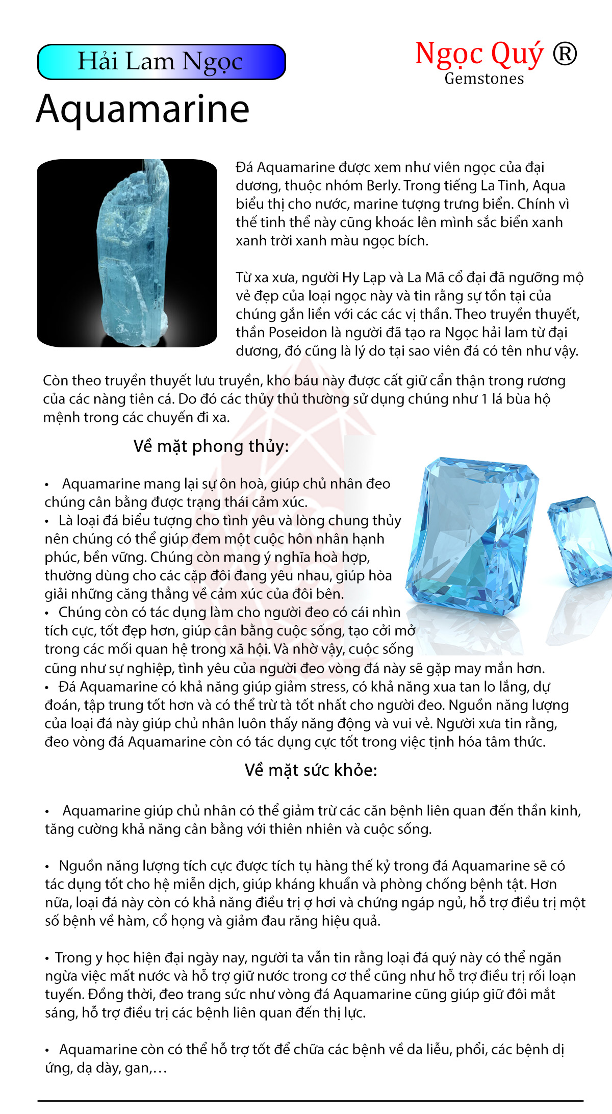 Đá Aquamarine được xem như viên ngọc của đại dương, thuộc nhóm Berly. Trong tiếng La Tinh, Aqua biểu thị cho nước, marine tượng trưng biển. Chính vì thế tinh thể này cũng khoác lên mình sắc biển xanh xanh trời xanh màu ngọc bích. Từ xa xưa, người Hy Lạp và La Mã cổ đại đã ngưỡng mộ vẻ đẹp của loại ngọc này và tin rằng sự tồn tại của chúng gắn liền với các các vị thần. Theo truyền thuyết, thần Poseidon là người đã tạo ra Ngọc hải lam từ đại dương, đó cũng là lý do tại sao viên đá có tên như vậy.