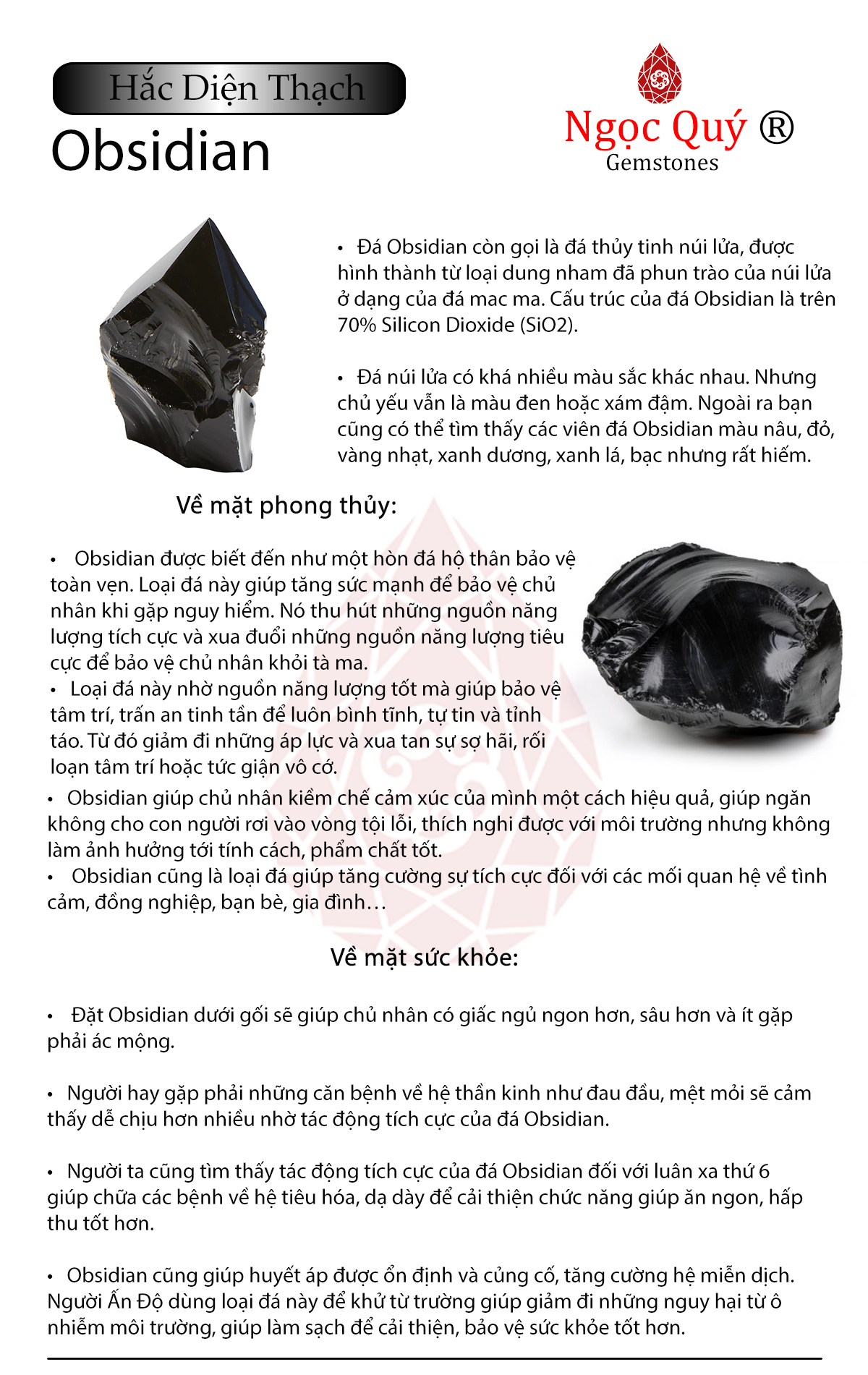 Đá Obsidian còn gọi là đá thủy tinh núi lửa, được hình thành từ loại dung nham đã phun trào của núi lửa ở dạng của đá mac ma. Cấu trúc của đá Obsidian là trên 70% Silicon Dioxide (SiO2).