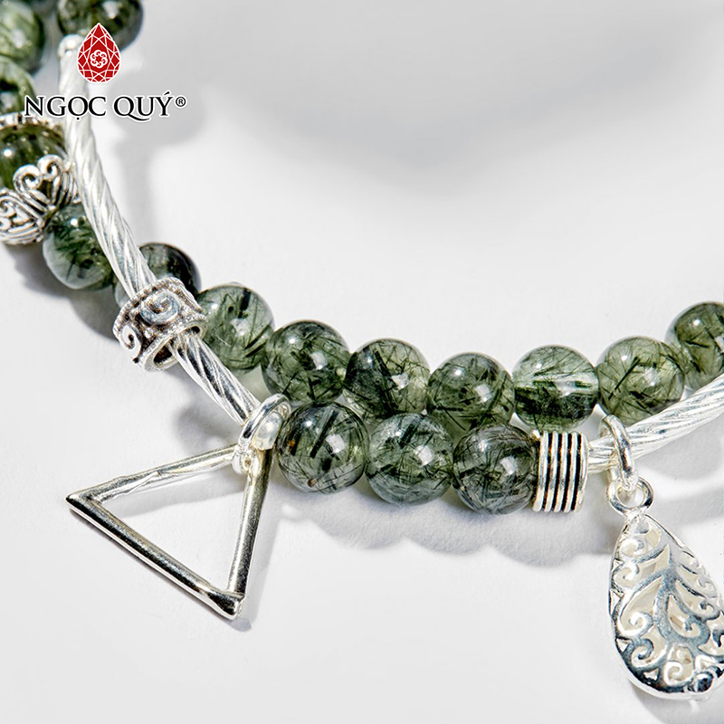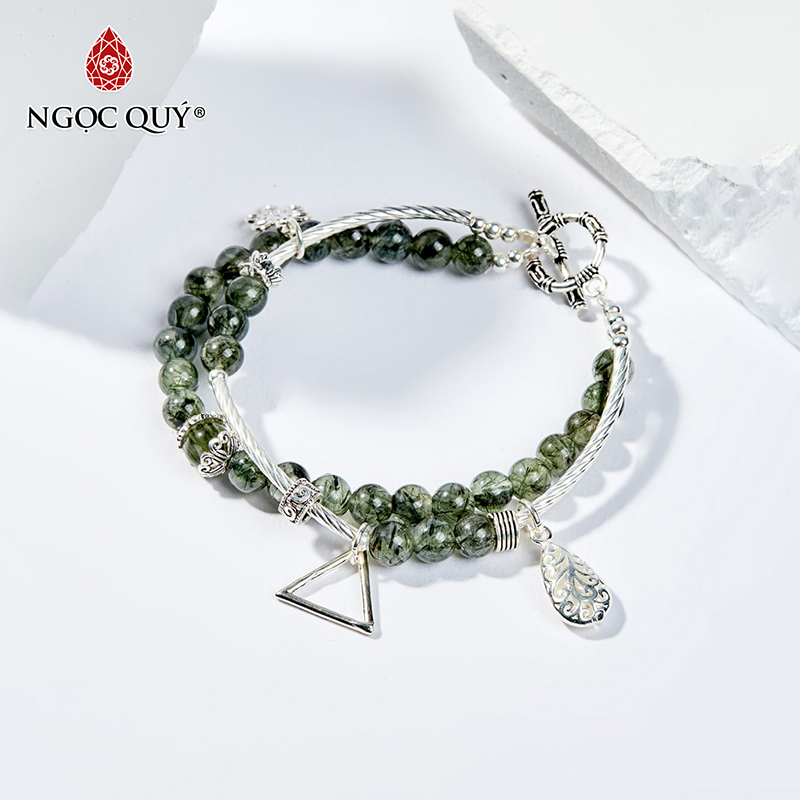 VÒNG TAY 2 LINE ĐÁ THẠCH ANH TÓC XANH PHỐI CHARM HOA