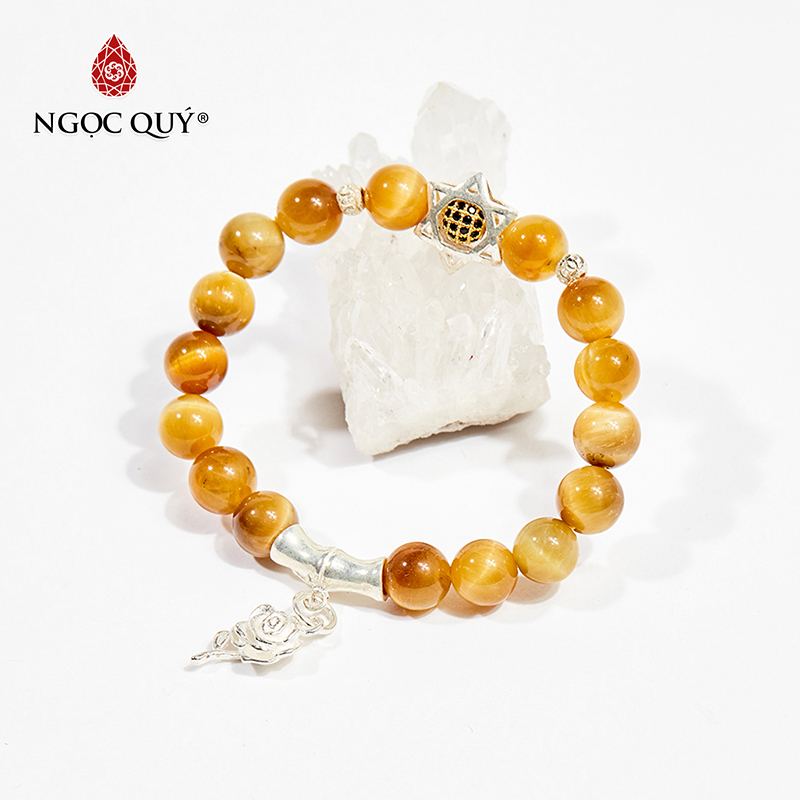 Vòng tay phong thủy đá mắt hổ vàng tâm phối charm hoa hồng