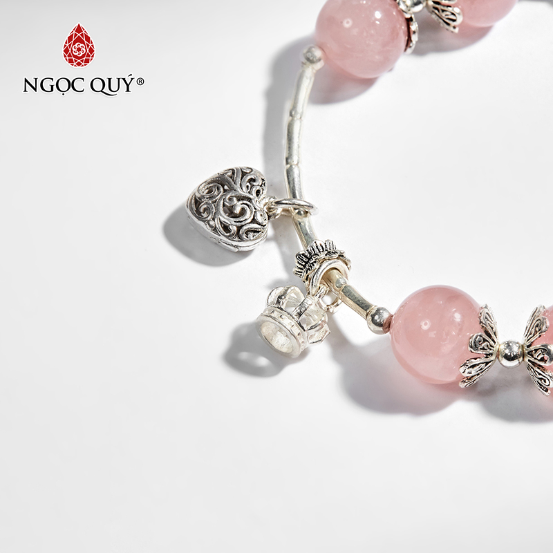 VÒNG TAY PHONG THỦY ĐÁ THẠCH ANH HỒNG PHỐI CHARM HỒ LY BẠC