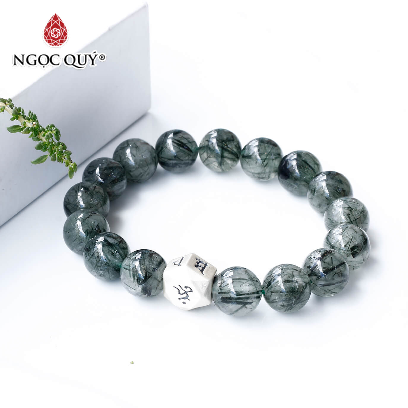 Vòng thạch anh tóc xanh phối charm lục tự bạc
